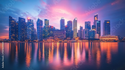Fototapeta premium Glistening city skyline at twilight, with reflections in a calm river, captivating and dynamic