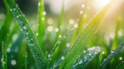 Naklejka premium Glistening Green Grass Blades with Morning Dew