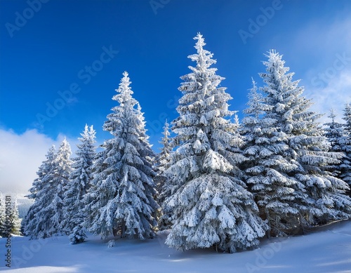 © Artbi, Fototapeta premium Glistening Snow-Covered Pine Trees Against a Bright Blue Winter Sky