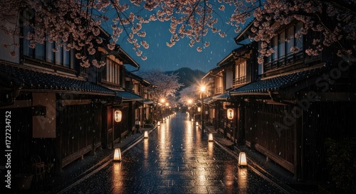 © Momoy Std, Fototapeta premium Glistening street in a Japanese town lined with traditional houses under blooming trees