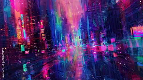 Fototapeta premium Glitch art cityscape with distorted neon lights, fragmented buildings, and digital artifacts