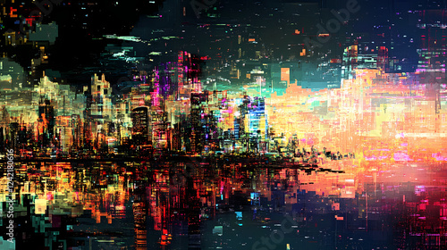 Naklejka premium Glitch art effects on a futuristic cityscape, cyberpunk, neon lights, digital...