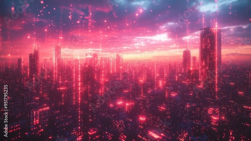 Fototapeta premium glitching cyberpunk cityscape fractured neon grid overlays retro 80s color palette digital artifacts holographic projections abstract geometric shapes data streams
