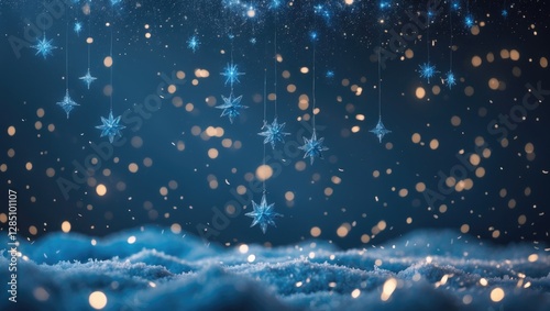 Obraz premium Glittering blue stars and snowflakes descend in the background.