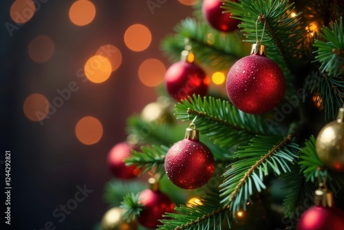 Obraz premium Glittering Christmas tree, colorful ornaments, soft bokeh lights , new year,...