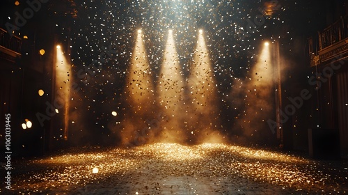 Obraz premium Glittering Confetti Raining on Festive Stage with Spotlights for Award Ceremony or New Year s Party