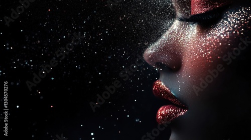 Obraz premium Glittering face profile in darkness with dazzling beauty details