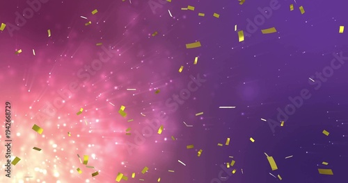 Fototapeta premium Glittering gold confetti filling pink-to-purple studio backdrop with bright...