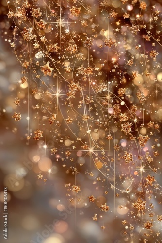 Fototapeta premium Glittering gold light background with star shapes, bokeh and delicate hanging...