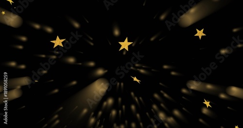 Fototapeta premium Glittering gold 5-pointed stars radiating long golden streaks on studio void,...