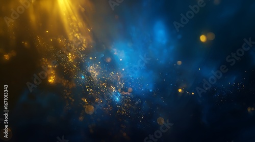 © YUANCEN, Naklejka premium Glittering golden particles swirling in dark blue atmosphere with shining light beams, magical abstract cosmic background, high-resolution luxury festive design