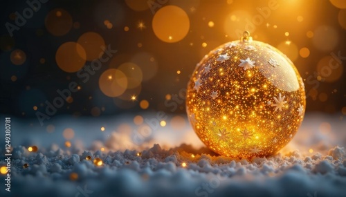 Fototapeta premium Glittering golden sphere with delicate snowflakes, festive scene, magical...