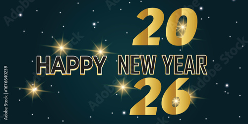 Naklejka premium 2026 Glittering New Year Card, Festive Sparkling Gold Background, Horizontal...