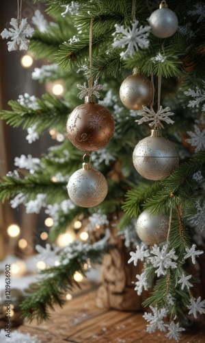 Fototapeta premium Glittering ornaments hang from the branches of a sturdy, wooden Christmas...