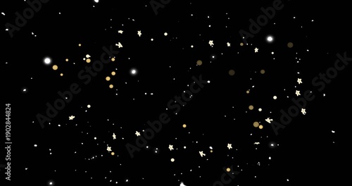 Fototapeta premium Glittering particles floating on black field, with white points, gold bokeh and cream star motifs