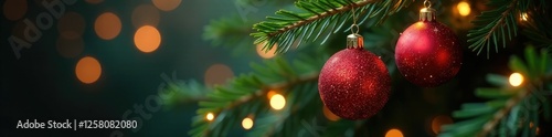© Prasert, Obraz premium Glittering red ornaments hang on a Christmas tree branch, holiday cheer, holly leaves