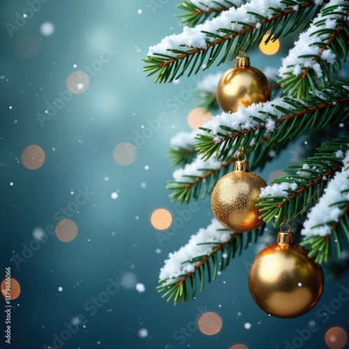 © Kaneki, Obraz premium Glittering snow-covered fir branches with golden ornaments hanging , snow covered branches, evergreen branches