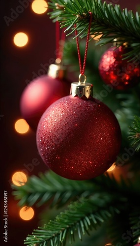 © yuwaree, Obraz premium Glittery red Christmas tree baubles with glitter and star, decorations, holiday