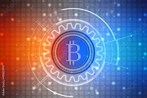 © Greentech, Obraz premium Global Abstract Bitcoin Crypto Currency Blockchain Technology World Map Background Illustration