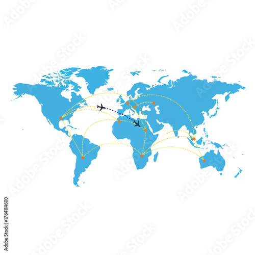 © Nelya, Obraz premium Global air travel routes on a blue world map illustration.