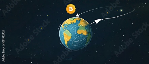 Naklejka premium Global Bitcoin cryptocurrency orbiting Earth.
