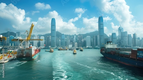 © t a k a h i r o, Naklejka premium global business background, With tall business towers. Business buildings on the skyline on the sea. city ​​scape and network connection concept. business globalization Connection technologies.