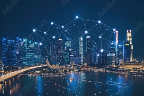 © Ifti Digital, Fototapeta premium Global business connections and networking in a vibrant cityscape at night, Global business concept of connections and information transfer in the world from singapore