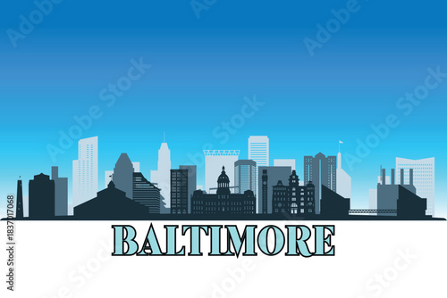 © Umm Hamzah, Naklejka premium Global city Baltimore shown in a detailed vector skyline with a bright blue sky
