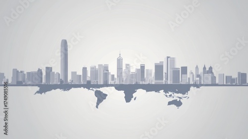 © Zeva, Obraz premium Global city skyline, world map below, gray tones, business concept