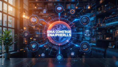 © Geser, Obraz premium Global commerce and e-commerce digital network visualization in a modern office environment from a central viewpoint