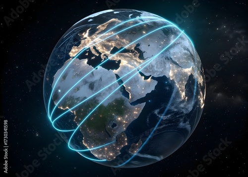 © Dilaram, Obraz premium Global Communication - Glass globe wrapped in neon blue fiber optic cables