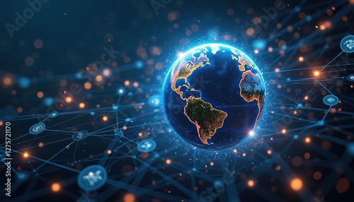 © Pete, Obraz premium Global communication network concept with Planet Earth in cyberspace. Futuristic design with interconnected nodes. Perfect solution, software, telecom, science, tech, innovation, business, worldwide