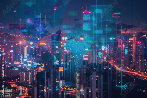 © Gibran, Fototapeta premium Global Connection - Cityscape with a World Map Overlay