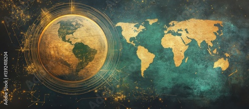 © Alexander, Naklejka premium Global connectivity concept with world map, network lines and sparkling nodes design