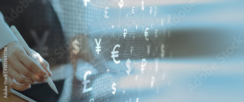 © WrightStudio, Fototapeta premium Global Currency Symbols Network Interface on Digital Tablet in Financial Technology Environment.