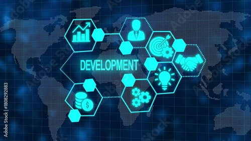 Fototapeta premium Global Development Network Connecting Progress and Strategy Icons on World Map Background growth