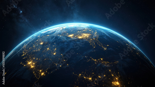 Obraz premium Global Digital Communication System with Flickering City Lights Around the Earth