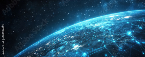 Obraz premium Global digital ecosystem featuring worldwide connectivity illustrated on wide banner format