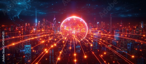 Fototapeta premium Global digital network illustration showcasing communication technology and artificial intelligence in a vibrant interconnected urban landscape.