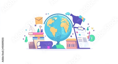 Fototapeta premium Global education concept with a globe, books, stationery, and a clipboard.