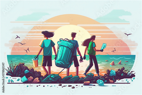 Fototapeta premium Global environmental pollution. volunteers collecting plastic garbage to...