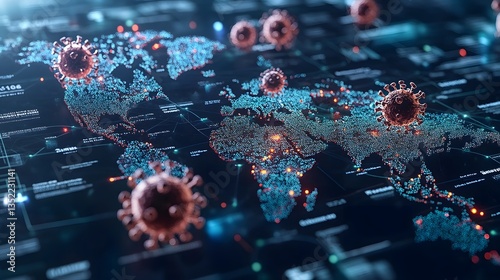 Fototapeta premium Global epidemiology network with scientists analyzing virus data interactive...