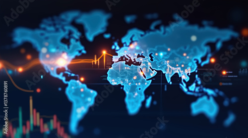 © Shootdiem, Fototapeta premium Global finance and investment growth with candlestick bars, market charts and economic trends on dark world map background