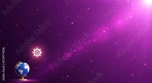 © Dab 32 Bore, Obraz premium Global innovation concept with glowing gear icon floating above Earth globe against a vibrant starry purple galaxy background