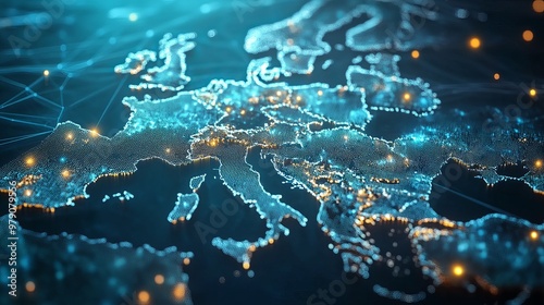 Fototapeta premium Global internet-connected communication technology in Europe. European connection lines for data transport and telecommunication. Blockchain, business, finance, IoT, and security.
