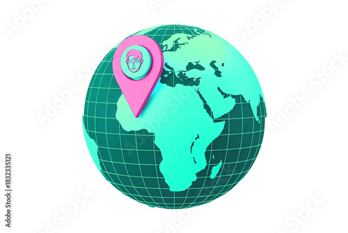 Naklejka premium Global location pin with human face icon symbolizing worldwide presence and personal connection for modern businesses and travel