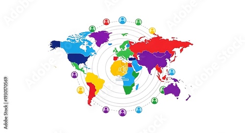 Fototapeta premium Global map illustration with colorful continents and markers indicating various locations around the world