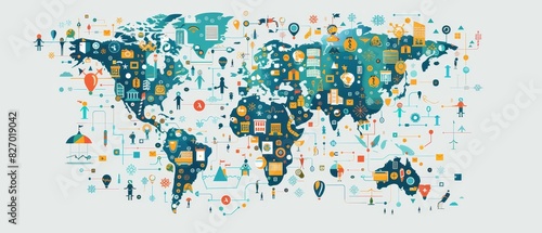 © Thanapipat, Obraz premium Global map infographic with icons representing various business, technology, and communication concepts worldwide.