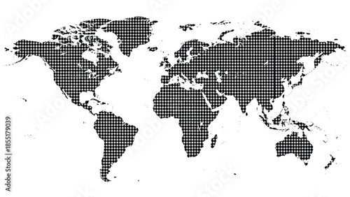 Obraz premium Global map of the world created with a black halftone dot pattern, presenting a modern, abstract representation of continents.