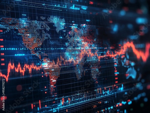 Obraz premium Global Market Trends: A high-tech digital display illuminates global market...